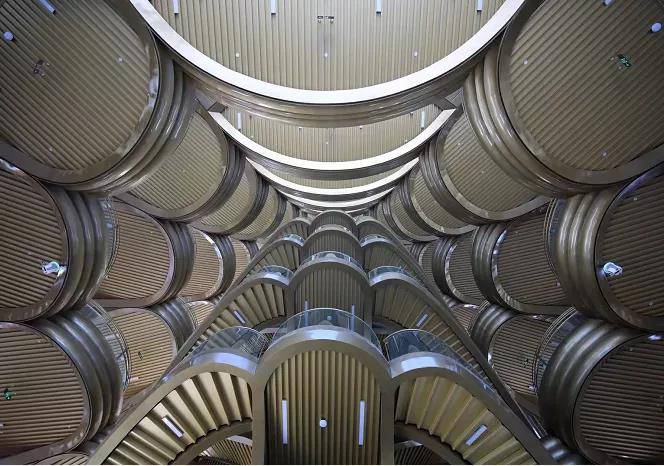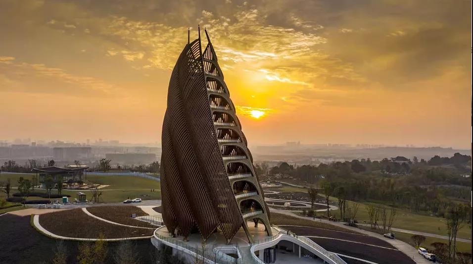 走進觀光瞭望塔內部,81片金色“芙蓉花瓣”團簇分布,營造出驚艷的視覺體驗。這些“芙蓉花瓣”正是觀光瞭望塔的載人平臺,81個平臺漸進式分布在瞭望塔內部,總共11層,每一片平臺都采用了成都市花芙蓉花瓣的造型,可為游客提供觀光、休息等服務。為了營造最完美的感官效果,平臺地面選用水磨石工藝生產的“金磨石”,平臺周圍欄桿均為竹節狀,在每一處細節都彰顯著匠心。據悉,為了達到這樣的景觀效果,項目團隊進行了多次“一比一打樣”的測試,最終挑選出兩種相互搭配的氟碳漆,選材用料不僅注重到色彩光澤,更考慮到使用特性及項目本身的超高環保要求。