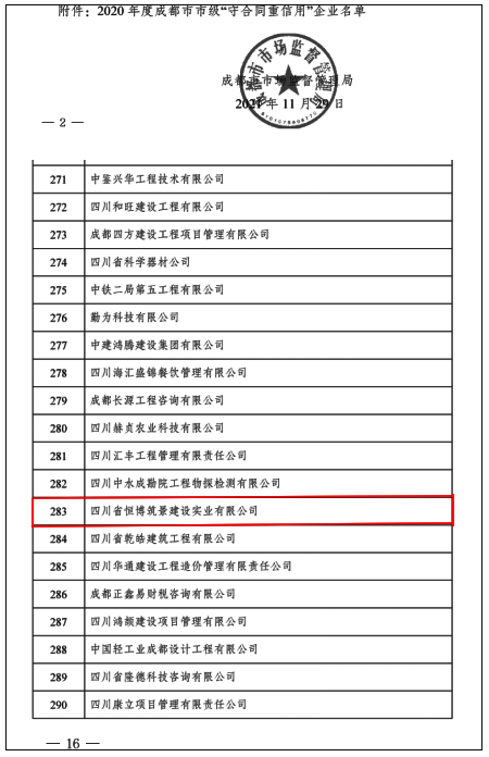 近日,2020年度成都市市級“守合同重信用”企業公示名單出爐,憑借著誠信守法的良好信譽、嚴謹規范的合同管理體系以及良好的經營效益,四川省恒博筑景建設實業有限公司順利通過成都市市場監督管理局的最終評審,榮獲2020年度市級“守合同重信用”企業稱號。