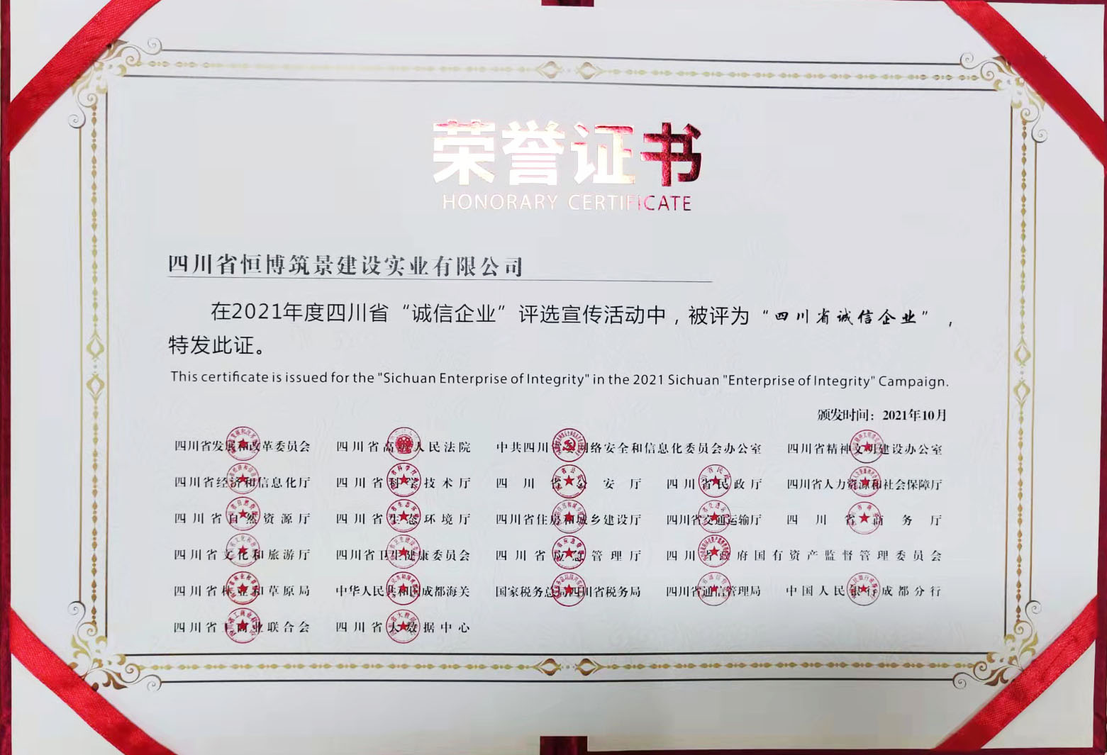 古人云:“求木之長者,必固其根本;欲流之遠者,必浚其泉源”。一家現(xiàn)代企業(yè)要實現(xiàn)真正的平穩(wěn)發(fā)展、基業(yè)長青,產(chǎn)品品質(zhì)和誠信經(jīng)營是關(guān)鍵、也是基石。近日,四川省發(fā)展改革委、省委網(wǎng)信辦、省國資委等25部門授予四川省恒博筑景建設(shè)實業(yè)有限公司2021年度四川省“誠信企業(yè)”榮譽稱號。